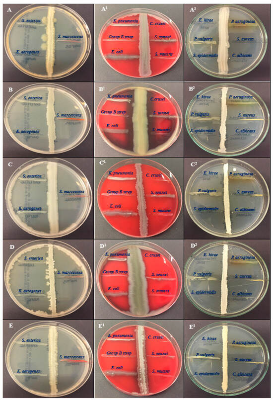Antagonistic activity of the bacteria of the genus Bacillus against pathogens. The antagonistic efficacy of all five isolates was examined against pathogenic bacteria, such as Salmonella enterica ATCC 35664, Serratia marcescens ATCC 13880, Klebsiella aerogenes ATCC 13048, Shigella sonnei ATCC 25931, Streptococcus mutans ATCC 25175, Klebseiella pneumoniae ATCC 13883, Group B Streptococcus, Escherichia coli ATCC 25922, Pseudomonas aeruginosa ATCC 9027, Staphylococcus aureus ATCC 29213, Enterococcus hirae ATCC 10541, Proteus vulgaris ATCC 6380, and Staphylococcus epidermidis ATCC 12228. Moreover, the antagonistic efficacy of all five isolates was examined against yeast strains such as Candida albicans ATCC 2091 and Candida krusei ATCC 14243. (A–A2)—BSS25, (B–B2)—BSS21, (C–C2)—BSS16, (D–D2)—BSS13, and (E–E2)—BSS12.