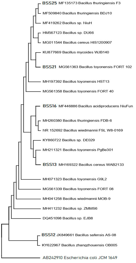Five (n = 5) bacterial isolates with increased antibacterial activity were isolated from distinct samples. Phylogenetic analysis of the 16S rRNA gene sequences indicated that all five candidate bacterial isolates, BSS25, BSS21, BSS16, BSS13, and BSS12, belong to five different Bacillus spp., respectively (Figure 3), as they are related to the aforementioned bacterial species in the phylogenetic tree.
