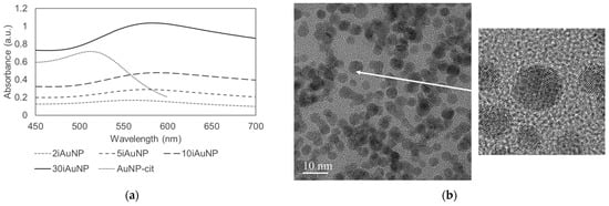 Physicochemical characterization by spectrophotometry of AuNPs-cit, 2, 5, 10, and 30iAuNPs (a) and a TEM picture of AuNPs-cit (b).