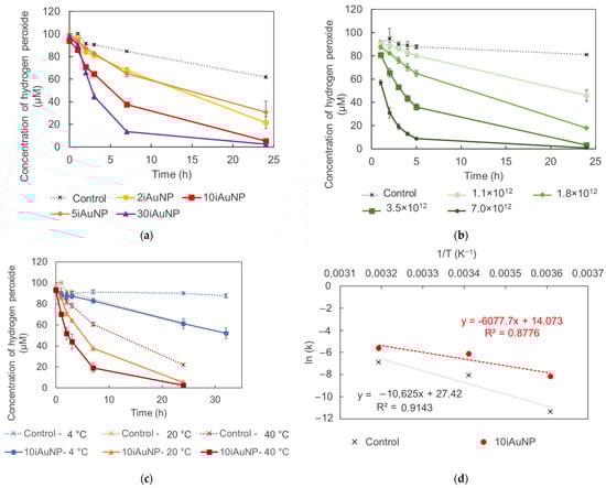 Concentrations of H2O2 at 20 °C under visible light in contact (control) with 2, 5, 10, or 30iAuNPs (a) or with increasing concentrations of AuNPs-cit, (b) (mean for n = 3 with corresponding standard deviation) the activity of 10iAuNPs as a function of the temperature, (c) and the resulting the Arrhenius equation (d) of the decomposition of this reaction in the presence (control) of 10iAuNPs (mean for n = 3 with corresponding standard deviation).