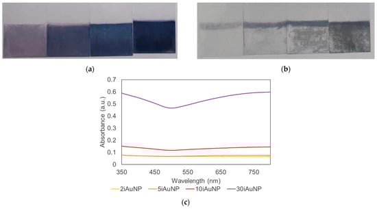 Nevertheless, after 24 h in the conditions of the reaction (pH = 9.5 and in contact with H2O2), the visual aspect of iAuNPs was completely altered (Figure 3a,b). The residual absorbance was in connection with the initial amount of AuNPs immobilized on the surfacel for example, 2iAuNPs ended colorless, whereas 30iAuNPs were the most colorful iAuNPs at the end of the reaction. The absence of a real SPR may prove the modification of the NP (Figure 3c).