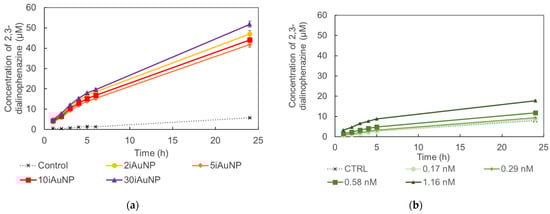 Formation of oxidized 2,3-dialinophenazine from a solution of OPDA and H2O2 in the presence (controls) of 2, 5, 10, or 30iAuNPs (a) or AuNPs-cit (b) (mean for n = 3 with corresponding standard deviation).