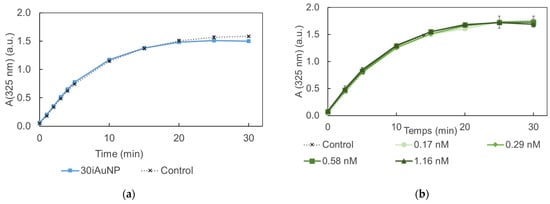 Evolution of the formation of purpurogalline from pyrogallol at 25 °C in contact (control) with 30iAuNPs (a) or AuNPs-cit (b) (mean for n = 3 with corresponding standard deviation).
