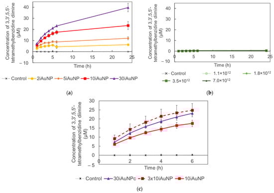 Formation of oxidized TMB from a solution of TMB in the presence (control) of iAuNPs (a) or AuNPs-cit and (b) comparison of the activity of 10iAuNPs, 30iAuNPs, and three 10iAuNPs dipped simultaneously (c) (mean for n = 3 with corresponding standard deviation).