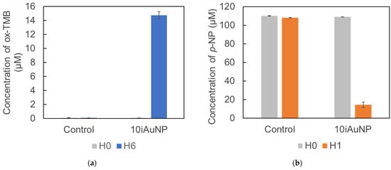 Concentration of formed ox-TMB after 6 h in the presence (control) of 10iAuNPs (peroxidase-like activity) (a) and a residual concentration of p-NP after 1 h in the presence (control) of the same 10iAuNPs (reductase-like activity) (b) observed during the successive catalysis reactions.