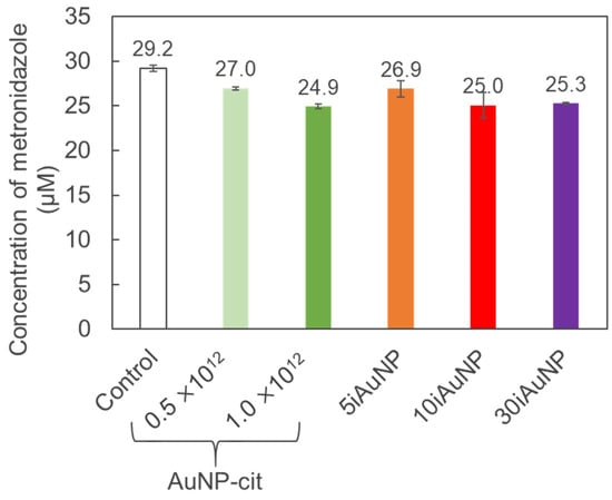Concentration of MTZ after 10 min of degradation in contact (control) with AuNPs-cit or 5, 10, or 30iAuNPs and NaBH4 at 20 °C and 150 rpm stirring (mean for n = 3 with corresponding standard deviation).