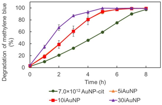 Both AuNPs-cit and iAuNPs were able to catalyze the degradation of MB under oxidative conditions (Figure 9). Unlike the degradation of MTZ, for this reaction, iAuNPs were more effective with a faster kinetic than the highest quantity of tested AuNPs-cit (7.0 × 1012 AuNP). The 30iAuNP achieved a complete discoloration (>99%) in 6 h (degradation activity was 99.4 ± 0.3%), and 5 and 10iAuNPs required 7 h (degradation activities were 99.2 ± 0.3 and 99.1 ± 0.5%, respectively), while after 8 h, the degradation activity of AuNPs-cit was 97.5 ± 0.5%. One possible explanation for the difference in efficacy of iAuNPs and AuNPs-cit in the degradation of MTZ and MB is the nature of reactions. MTZ was degraded using reduction whereas MB was degraded by oxidation. As demonstrated earlier, iAuNPs appeared to have an increased reactivity compared to AuNPs-cit for oxidation reactions. On the other hand, we have already demonstrated that immobilization reduces the kinetic of AuNPs-cit in the case of reductase-like activity [10].