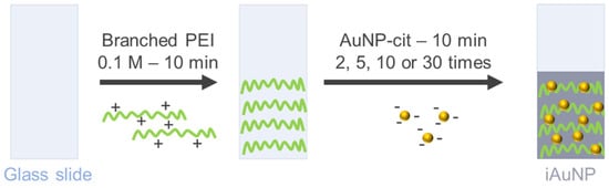 A Tris−HCl buffer was obtained by dissolving 18.2 g of Trizma® base in 1 L of ultrapure water (0.15 M), and pH was adjusted to pH = 7.4 with HCl 12 M. A 0,1 M polymer solution was prepared by dissolving branched polyethyleneimine (PEI) in a Tris−HCl buffer. The activated glass slides were soaked for 10 min in the PEI solution and were immersed in a bath of AuNPs-cit for 10 min 2, 5, 10, or 30 times (corresponding to 2, 5, 10, or 30-iAuNPs, respectively) (Figure 10). Each bath was followed by a rinse step with a Tris−HCl buffer (3 min) and a soak in water. The iAuNPs were stored at +20 °C, and we demonstrated their activity over 130 days [10].