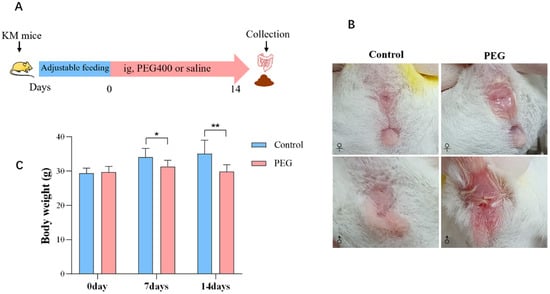 Observation of the general condition of mice. (A) Schematic diagram of PEG400 treatment. (B) Redness and swelling of anus in mice, ♀: female, ♂: male. (C) Mice’s body weight at days 0, 7, and 14. Data are presented as mean ± SD (n = 12). * p < 0.05, ** p < 0.01 compared with control group.