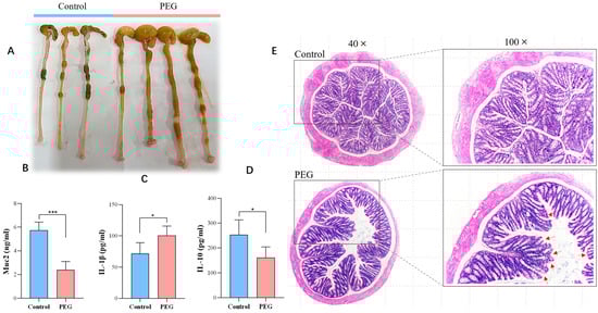 The appearance of the colon of mice in the PEG group was noticeably different from that in the control group, as shown in Figure 2A. In the PEG group, the colon cavity became wider, the exterior appeared congested, the cecum was swollen and filled with gas, and the intestinal contents were thin. ELISA results (Figure 2B–D) indicated a significant decrease in Muc2 content, which is a main component of intestinal mucus; meanwhile, there was an increase in the pro-inflammatory factor IL-1β level and a marked decrease in the anti-inflammatory factor IL-10 level. As shown in Figure 2E, colon H&E staining showed that the intestinal mucosa of the control group was compact, the intestinal wall was thick, the intestinal fold structure was tight and neat, and the intestinal epithelial cell arrangement was complete. In the PEG group, the intestinal cavity became wider, the intestinal wall was thinner, the intestinal fold structure was relaxed, and the intestinal mucosa was incomplete with mild damage. The crypt spacing of the intestinal glands was widened, and goblet cells were absent and reduced in number. In summary, PEG400 has a certain impact on the integrity of intestinal mucosa and can cause mild intestinal inflammation and edema.