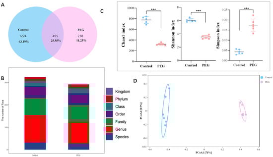 Analysis of gut microbiota diversity. According to the Venn graph results, a total of 1937 operational taxonomic units (OTUs) were generated in the two groups, the total number of mutual OTUs in the control group and the PEG group was 495, the number of unique OTUs in the control group was 1224, and the number of unique OTUs in the PEG group was 218 (Figure 3A). The number of OTUs of intestinal microorganism was obviously reduced in the PEG group. There were also differences in the number of microorganisms in different taxa (Figure 3B). Chao1, Shannon, and Simpson indexes are commonly used to evaluate the alpha diversity of gut microbiota. Chao1 index reflects richness, while Shannon and Simpson indexes mainly reflect diversity. Compared with the control group, the α-diversity of gut microbiota in the PEG group was significantly decreased (Figure 3C). Further, principal coordinate analysis (PCoA) was used to conduct beta diversity analysis. As shown in Figure 3D, the bacterial composition of the control group and PEG group was obviously clustered separately. The results indicate that there were differences in intestinal microorganism composition between the two groups, and PEG400 caused changes in gut microbiota structure.