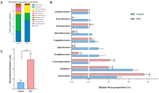 Analysis of PEG400 on gut microbiota at the phylum level. (A) The average percent of community abundance on phylum level in the two groups. (B) Plot of relative abundance statistics for the top 10 at the phylum level. (C) The Bacteroidetes/Firmicutes abundance ratio. Data are presented as mean ± SD (n = 6). * p < 0.05, ** p < 0.01, *** p < 0.001 compared with control group.