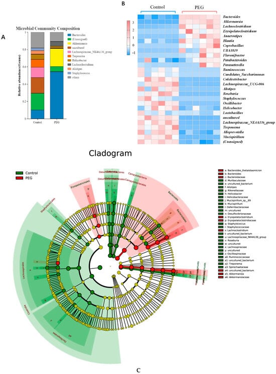 Analysis of PEG400 on gut microbiota at the genus level. (A) The average percent of community abundance. (B) Visual heat maps of microbial communities. (C) The LEfSe multilevel species hierarchy tree.