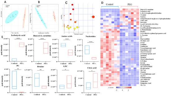 Screening for differential metabolites. With variable importance for the projection (VIP) > 1 and p < 0.05 as the conditions, and combined with HMDB and KEGG databases to screen differential metabolites, a total of 42 differential metabolites were screened from feces, including short-chain fatty acids, butyryl-L-carnitine, PC, and degradation products LPC, such as amino acids, betaine, organic acids and derivatives, nucleotides, etc. The heatmap of differential metabolites is shown in Figure 6D. To further analyze the trend of differential metabolites between the two groups, we drew a box diagram for metabolites with significant differences; the box diagram of the variation trend of differential metabolites is shown in Figure 6E. Compared with the control group, the levels of butyryl-L-carnitine, isobutyric acid, LPC, and citric acid in the PEG group were significantly upregulated, while the levels of amino acids, PC, betaine, and nucleotides were significantly downregulated.