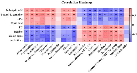 To further investigate the linkages between gut microbiota and fecal metabolites, we used Spearman’s correlation analysis to analyze the correlation between the fecal differential metabolites (isobutyric acid, butyryl-L-carnitine, amino acids, etc.) and the differential microbiota (Akkermansia, Coprobacillus, Anaerostipes, etc.) of the two groups. As shown in Figure 7, the results suggest that the differential metabolites were significantly correlated with most of the gut microbiota; some bacteria have a strong correlation with various metabolites.