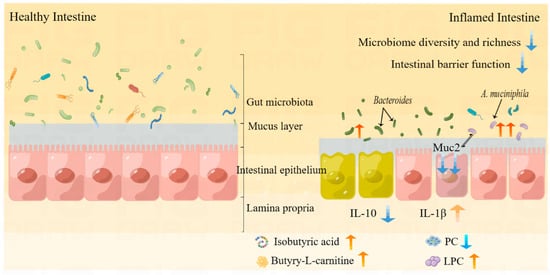In addition, PEG400 increases the level of butyryl-L-carnitine in feces, which serves as an indicator of abnormal lipid and energy metabolism [48]. However, it has also been reported that butyl L-carnitine, a butyrate ester of carnitine, is known to help maintain intestinal health and prevent intestinal inflammation [49]. This outcome was unexpected. The levels of isobutyric acid, a short-chain fatty acid (SCFA), were found to be upregulated in fecal metabolites. SCFAs are metabolites produced by intestinal microorganisms and play an important role in maintaining the integrity of the intestinal barrier [50]. A. muciniphila and Bacteroidetes are also capable of metabolizing and producing SCFAs. This finding is consistent with the results of Spearman’s correlation analysis, which showed a significant positive correlation between the level of isobutyric acid and the relative abundance of A. muciniphila, Bacteroidetes, Lachnoclostridium, Blautia, etc. However, it has been observed that isobutyric acid can reduce the integrity of Caco-2 cells’ intestinal barrier and increase intestinal permeability, potentially having an opposite effect on human health. [51].