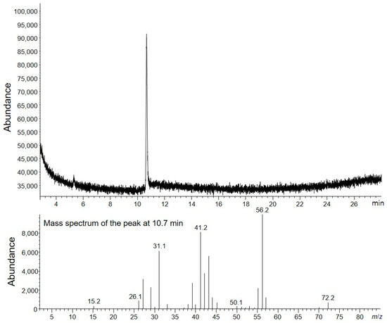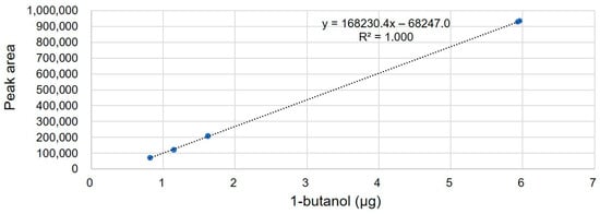 Three replicates of TCH (2–3 mg) were prepared as described in the Experimental Section, and HS-GC/MS analysis was performed. The TIC chromatogram of the HS-GC/MS analysis revealed one peak of the residual solvent (Figure 2). Based on the MS spectrum and GC retention time, a peak corresponding to 1-butanol was confirmed. The quantity of 1-butanol in TCH was calculated from four concentration levels of 1-butanol calibration standard solutions. The linearity of the method was investigated in water at four concentration levels in the range 0.5–6 µg, based on a 2–3 mg sample. Two replicates were used for each level. The linear regression plots are depicted in Figure 3. The correlation coefficient (R2) was 0.9999. The residual organic solvents in the mass fraction (Pvolatile organic solvent) were calculated using Equations (4) and (5).