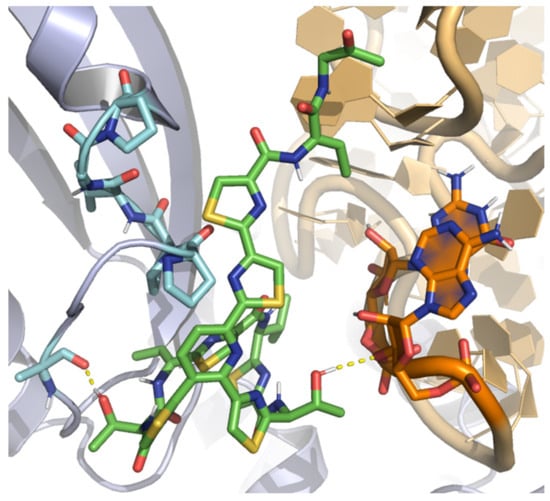 Best docking pose of MP2 and analogue 57 bound to their known receptor. L11 and 23s rRNA are represented by light blue and light orange ribbons, respectively. Interacting residues are shown as stick representations. Hydrogen bonds are shown as yellow dashed lines. (Top): computed binding pose of MP2 (green). (Bottom): computed binding pose of 57 (purple), showing additional hydrogen bonding interactions [].