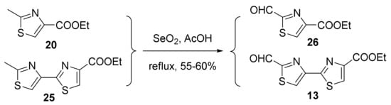 Synthetic work toward thiocillin I provided an opportunity to refine the avenue to thiopeptidic heterocyclic clusters. First, a better synthesis of thiazole-2-carboxaldehydes was clearly needed. A plausible solution entailed a SeO2 oxidation of readily available 2-methyloxazoles. However, such a transformation appeared to be unknow. Indeed, it was determined that 2-methylthiazoles such as 20 and 25 were inert toward SeO2 in refluxing ethanol or dioxane (customary conditions), but they were rapidly converted into aldehydes 26 and 13 in refluxing acetic acid (Scheme 5). Some degree of overoxidation to a carboxylic acid and consequent decarboxylation was also observed, but the aldehydes were obtained with a 55–60% yield. A significantly more concise and efficient route had thus materialized [].