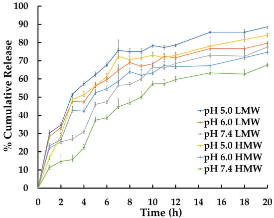 The release data from this study showed that the pH and molecular weight of CS significantly influenced the release of AM from AM-F-NPs (Figure 5). At a low pH, the surface charge of the CSNP becomes positive, reducing electrostatic interactions and facilitating drug release. This pH responsiveness is beneficial under physiological conditions (pH 7.4), in which most of the drug remains within the nanoparticles, causing prolonged circulation and reducing side effects on healthy tissue. However, once drug-containing CSNPs are endocytosed by tumor cells, the lower pH in the tumor microenvironment promotes rapid drug release, potentially increasing the effectiveness of cancer therapy. This pH-dependent drug release mechanism in AM-F-NPs offers a promising approach for targeted and controlled drug delivery in cancer treatment. High molecular CS has a larger number of amino groups, and the steric effect can result in the formation of CSNPs, which are larger and potentially more compact than those formed using CS with a lower molecular weight. Additionally, the particle size of the NPs can impact drug dissolution following the Noyes–Whitney equation. The Noyes–Whitney equation describes the dissolution rate of a solid drug particle and states that the dissolution rate is directly proportional to the surface area of the drug particles [74,75].