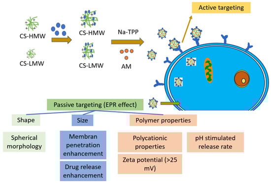 Nanomicelle formation and polymeric nanoparticle encapsulation have been proven to enhance the solubility of AM and facilitate its targeted delivery to specific organs [18]. Various studies, conducted both in vitro and in vivo, have demonstrated the enhanced cytotoxicity, antiproliferative activity, and induction of apoptosis when AM is delivered through these nanoparticle systems, such as transferrin-conjugated lipid–polymer hybrid NPs [19], AM-encapsulated poly(lactic-co-glycolic) acid (PLGA) NPs [20], AM-CS/sodium alginate NPs [21], AM-CS/carrageenan NPs [22] and hyaluronic acid-coated CS-NPs [23]. Additionally, NPs constructed with crosslinked CS and glyoxal have demonstrated controlled-release properties, making them a promising drug-delivery system for hydrophobic compounds such as AM [24].