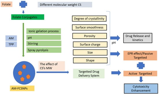 The MTT assay is commonly used to assess cytotoxicity. In the current study, the presence of free amine groups and reduced steric hindrance resulting from folate conjugation may have facilitated the growth of CS-NPs. Folate has a strong affinity for folate receptors (FRs) and is stable, cost-effective, and not very immunogenic. F-CS-NPs have been used to encapsulate various anticancer drugs, including doxorubicin, 5-fluorouracil, ursolic acid [79], and cytarabine [46], and as DNA-delivery vehicles [35]. Conjugating polymers with targeting ligands, such as folate, has become a popular approach for targeted drug delivery. The increased internalization of NPs through endocytosis is mostly due to the specific interaction of folate receptors overexpressed in breast cancer cells [69]. In previous studies, passive targeting based on physicochemical properties, such as size and surface charge, has been easily adjustable by adjusting the component molecules or fabrication method [57]. F-CS-AM-NPs may increase AM effectiveness in two ways (Figure 7).