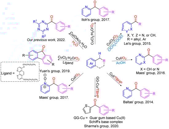 - Kim, H.Y.; Oh, K. Recent advances in the copper-catalyzed aerobic Csp3–H oxidation strategy. Org. Biomol. Chem. 2021, 19, 3569–3583. [Google Scholar] [CrossRef] [PubMed]