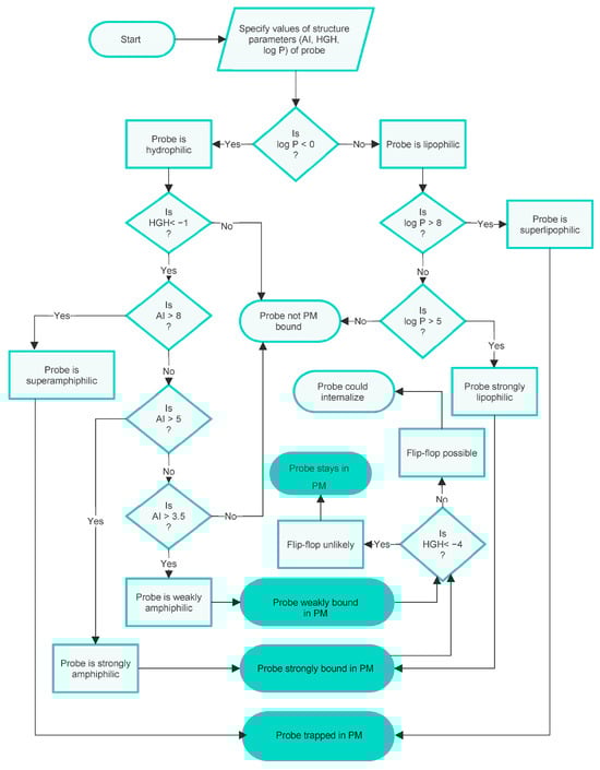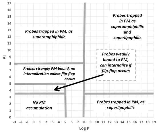 To summarise, the integrated model visualised in the flowchart in Figure 2 predicts three types of PM binding. It also predicts when entry into the cell interior can occur and gives some indication of the strength of binding, or lack of binding, to the PM. These conclusions are based on the cut-off values of the parameters AI, HGH, and log P describing the probes, which reflect the physicochemical character of the probes.
