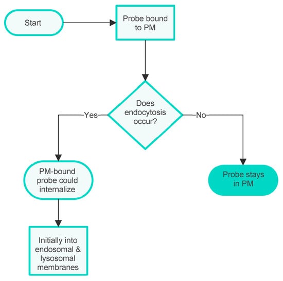 Another biological complication is also sometimes significant for PM probe accumulation. Namely, the possibility that the PM is taken into the cell during an endocytic process, carrying with it any bound probe. There are several distinct processes of this kind [25], but this complexity will not be discussed here as it does not significantly affect the arguments presented. At this point, it is sufficient to note that in an experimental situation, the possibility of membrane internalisation can be manipulated, e.g., by lowering the temperature of the experimental system to prevent endocytosis [26] or by the administration of inhibitors of the various processes [27]. Possible additional outcomes of PM internalisation are indicated in the additional flowchart given in Figure 3.