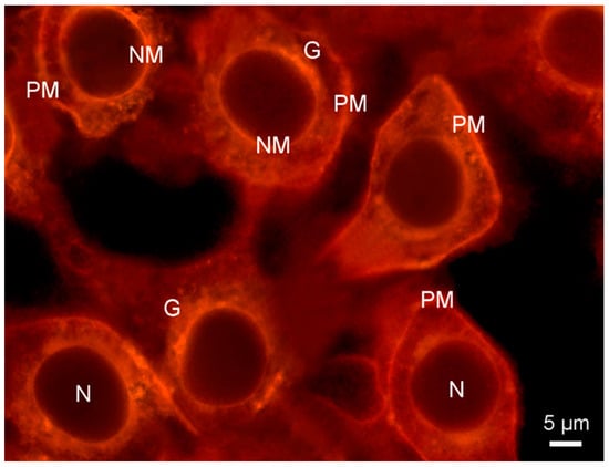 Fluorescence micrograph showing plasma membrane and other organelle membranes of cultured HeLa cells visualised with merocyanine 540 (20 μM in DMEM medium for 5 min, double blue-green exciting light: 460/490 + 510/550 nm), followed by a washing step with DMEM for 10 min. Substantial probe internalisation occurred after 15 min, with only the membrane-free nuclei (N) remaining unstained. G: Golgi. NM: nuclear membrane. PM: plasma membrane.