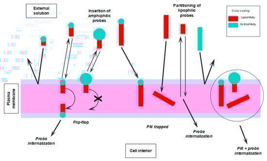 Next, consider the loss of a probe previously taken into a membrane from an external medium. This loss may occur either by the probe returning to the external medium or by its permeation into the cell interior. Regarding partitioning, unless the probe is trapped within the lipophilic domain of the membrane, it will indeed bleed out in this way. However, with probes inserted into the membrane due to amphiphilicity, the situation is more complicated. Thus, if the HG is not too hydrophilic or too large, the molecule might then flip-flop across the membrane to the inner leaflet, from where it might enter the cell interior [10].