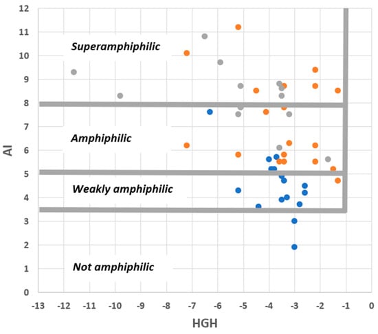 Distribution of commercial surfactants (orange circles), pharmaceutical agents (blue circles), and saponins (grey circles) on an AI–HGH chart. The features specified are those predicted by the integrated QSAR model to result in amphiphilicity.
