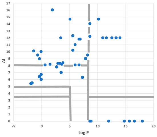 Finally, we looked at the set of fluorescent PM probes listed in Table 4 with two issues in mind. First, consider the roles of amphiphilicity, lipophilicity, and flip-flop directly in the case of fluorescent probes. Second, to check on which mechanisms were involved with the PM accumulation of these compounds. To accomplish this, we used an AI-Log P chart since, as seen in the annotated version of this diagram given in Figure 7, this provides a direct visual identification of six mechanistic categories involving amphiphilicity and lipophilicity while also linking to the role of flip-flop. As Figure 8 shows, PM probes fall into most mechanistic categories, and, not surprisingly, most probes are either superamphiphilic or superlipophilic. The exploitation of superamphiphilicity is particularly striking. This perhaps reflects the fact that superlipophilic compounds are typical of low aqueous solubility and require technical ingenuity to facilitate their solubilisation in cell-compatible solutions, e.g., [29].