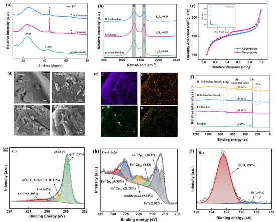 (a) XRD patterns; (b) Raman spectra. D band corresponds to disordered carbon or defective graphite structure; G band corresponds to E2g mode vibration of complete honeycomb sp2 hybrid carbon grid. (c) The nitrogen adsorption–desorption isotherms and pore-size distributions of B-Fe/biochar; (d) SEM images; (e) SEM mapping images of B-Fe/biochar; (f) XPS survey spectra; (g) high-resolution XPS spectrum of C 1s; (h) high-resolution XPS spectrum of B 1s; (i) high-resolution XPS spectrum of Fe 2p.