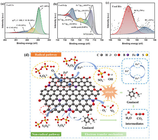 High-resolution XPS spectrum of (a) C 1s, (b) Fe 2p and (c) B 1s of used B-Fe/biochar catalyst; (d) mechanism of GL degradation by B-Fe/biochar catalytic activation of PDS.