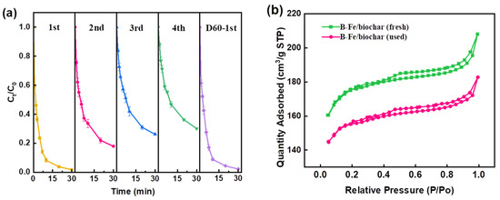 The stability and reusability of B-Fe/biochar-activated PDS for the degradation of GL were evaluated. As shown in Figure 5a, the degradation performance of B-Fe/biochar stored in air for 60 days still maintained good catalytic performance, while the removal efficiency of GL decreased from 98.30% to 69.93% after three cycles of reuse (Figure 5a). The GL degradation rate decreased with the increase in reuse cycles mainly due to the following two reasons: (1) the inevitable consumption of α-Fe0 during the reaction; and (2) the decrease in contact area between B-Fe/biochar and PDS caused by the coverage of GL and degradation products on the biochar [71]. This coincided with the N2 adsorption–desorption curves of B-Fe/biochar before and after the catalytic reaction (Figure 5b), and the specific surface area of B-Fe/biochar decreased after the reaction. Further functionalization of the used biochar might improve its performance, but the specific functionalization treatments need to be further explored. In addition, the leaching of Fe during the catalytic reaction was examined. Compared to Fe/biochar (iron leaching 2.21 mg/L), B-Fe/biochar showed much lower iron leaching in the reaction (1.05 mg/L), exhibiting satisfactory long-term stability and reusability. The reason might be ascribed to the smaller pore size of B-Fe/biochar, in which iron particles were not easy to leach.