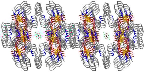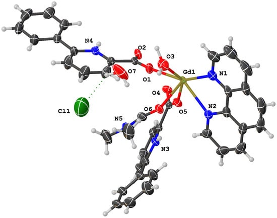 The coordination environment of Gd(III) in complex (1) is given in Figure 2. Selected bond lengths (Å) and angles (°) for complex (1) are given in Table 1. Figure 3 shows the 3D network structure of complex (1). The asymmetric unit of complex (1) contains one Gd(III) ion, two 6-phenylpyridine-2-carboxylate ligands, one 1,10-phenanthroline ligand, one coordinated N,N-dimethylformamide molecule, one coordinated water molecule, one uncoordinated chloride anion, and one uncoordinated water molecule (Figure 2). The structural analysis reveals that complex (1) is a cation–anion complex and two Gd(III) ions are eight-coordinated with four O atoms (O1, O5, O2a, O4a, or O1a, O2, O4, O5a) of four different bidentate L ligands, one O atom (O6, or O6a) of DMF molecules, two N atoms (N1, N2, or N1a, N2a) of Phen ligands, and one O atom (O3 or O3a) of coordinated water molecules (symmetry code: 0.5-x, 1.5-y, 1.5-z). Complex (1) forms a dinuclear structure by bidentate chelate coordination mode of 6-phenylpyridine-2-carboxylate ligands, and the distance of two adjacent Gd(III) ions is 4.388 Å. Eight oxygen atoms are coordinated with two adjacent Gd(III) ions to form two stable eight-membered rings: ring 1 (O1-Gd1-O2a-C36a-O1a-Gd1a-O2-C36-O1) and ring 2 (O4a-Gd1-O5-C24-O4-Gd1a-O5a-C24a-O4a). The dihedral angle of ring one and ring two is 87.32°, indicating that the two eight-membered rings are nearly vertical. The bond distances of Gd–O and Gd–N are 2.313(3) Å (Gd1-O1), 2.379(3) Å (Gd1-O2a), 2.436(3) Å (Gd1-O3), 2.372(3) Å (Gd1-O4a), 2.331(3) Å (Gd1-O5), 2.406(3) Å (Gd1-O6), 2.560(3) Å (Gd1-N1), and 2.585(3) Å (Gd1-N2), respectively, which are consistent with those reported in the literature [14,19,20]. The uncoordinated chloride anion and the uncoordinated water molecule are embedded in the molecule by intramolecular O-H···Cl hydrogen bonds. And complex (1) molecules form a three-dimensional network structure (Figure 3) by the π–π interaction of aromatic rings.