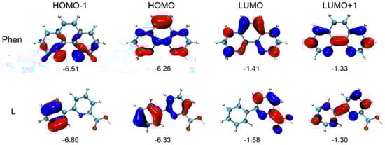 Electron density distributions and energy levels (eV) of HOMO-1, HOMO, LUMO, and LUMO+1 for the ligands L and phen (isovalue = 0.05 e•bohr-3). All energies are in eV.