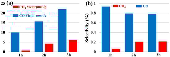 As a newly discovered Gd(III) complex material, we want to try to explore its application field. Therefore, we tested its photocatalytic CO2 reduction activity, and the results are shown in Figure 6. Figure 6(a) shows that photocatalytic CO2 reduction activity using complex (1). Figure 6(b) describes that product selectivity diagram in the photocatalytic CO2 reduction reaction. It can be observed that the Gd(III) complex exhibits obvious photocatalytic CO2 activity. The main products of the whole photocatalytic reaction are CO and CH4, and their yields have reached 22.1 μmol/g and 6.0 μmol/g, respectively, after three hours of UV–vis light irradiation. In addition, the selectivity of CO can achieve 78.5%. With the increase in reaction times, the total amount of product also gradually increased, indicating that the photocatalytic CO2 reduction was sustainable. We have reported that a new Gd(III) coordination polymer exhibited photocatalytic CO2 reduction with a CO yield of 60.3 μmol•g−1 and a CO selectivity of 100% [16]. Compared with our previous results, complex (1) gives a different product, activity, and selectivity in photocatalytic CO2 reduction. These results demonstrate that the environment of the catalytic center Gd(III) is vital to its catalytic activity. As a photocatalyst, the light absorption capacity is important. So, the UV–vis absorption spectrum of complex (1) was examined. Figure S1 (Supplementary Materials) exhibits the UV–vis absorption spectrum of the complex (1). It could be observed that the absorption edge of complex (1) is in the range of ultraviolet. Therefore, the researchers can design an idea to expand the light absorption capacity of complex (1) to improve its performance in photocatalytic CO2 reduction in future studies.