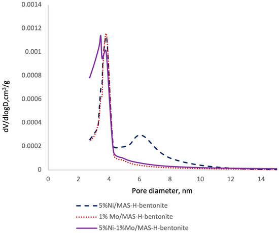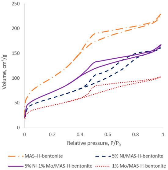 According to the data in Table 1, there was a decrease in the specific surface area and pore volume of the catalysts promoted by nickel and molybdenum compared to MAS-H-bentonite’s specific surface area. Possibly, this is due to a partial block of the aluminosilicate pore system by the promoting additives. The specific surface area and the decrease in pore volume are the main indicators of metal attachment to carrier pores [25].