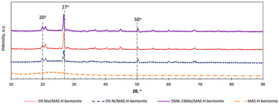 Further approvals of a final structure formation were obtained by measurements of X-ray diffraction on the promoted catalysts based on MAS and H-bentonite. An X-ray phase analysis of the supported nickel and molybdenum catalysts gives useful information about the presence or absence of Ni- and Mo-phases. X-ray diffraction patterns of the catalysts containing nickel and molybdenum in the 2θ range 10–90 are presented in Figure 3.