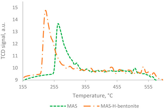 According to Figure 4 and Table 2, for the mesoporous aluminosilicate and MAS-H-bentonite samples, the ammonia desorption curves have the same shape, i.e., the shape with one thermal desorption peak. However, these samples differ in strength and concentration of acid sites. So, for instance, a sample of synthesized mesoporous aluminosilicate has approximately 98% weak acid sites (1144 µmol/g) and 2% medium-strength acid sites (27 µmol/g). Mixing the mesoporous aluminosilicate with the activated bentonite leads to a shift in the ammonia desorption peak towards lower temperatures. However, the area of the ammonia desorption curve becomes bigger.
