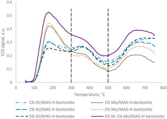 Thus, from the TPD-NH3 results, it has been shown that the nature and content of promoting catalysts’ additives affect the concentration and strength of the acid sites. The 5% Ni-1% Mo/MAS-H-bentonite sample has a greater number of acid sites available for the chemisorption of NH3 than the samples of catalysts promoted only by nickel and molybdenum.