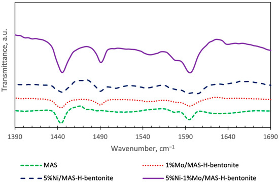 The absorption bands are fixed at 1445–1447, 1490, and 1595 cm–1 on the studied samples, as in the case of mesoporous aluminosilicates. The absorption bands at 1445 and 1595 cm–1 are explained by the presence of hydrogen-bonded pyridine adsorbed on Lewis acid sites. A Strong Lewis bond is established with pyridine at 1445–1447 cm−1, and a weak Lewis bond is established with pyridine at 1595 cm−1 [34]. The band observed at about 1490 cm–1 is associated with the adsorption of pyridine on both Lewis and Brønsted acid sites. The appearance of a band at 1550 cm−1 in the IR spectrum of Ni-Mo/MAS-H-bentonite catalyst is explained by the presence of hydrogen-bonded pyridine adsorbed on Brønsted acid sites. It can be seen from the diffuse reflectance IR spectra that the Ni-Mo/MAS-H-bentonite catalyst sample has stronger Lewis and Brønsted sites and high acidity compared to monometallic catalysts, which matches well with the TPD-NH3 data.