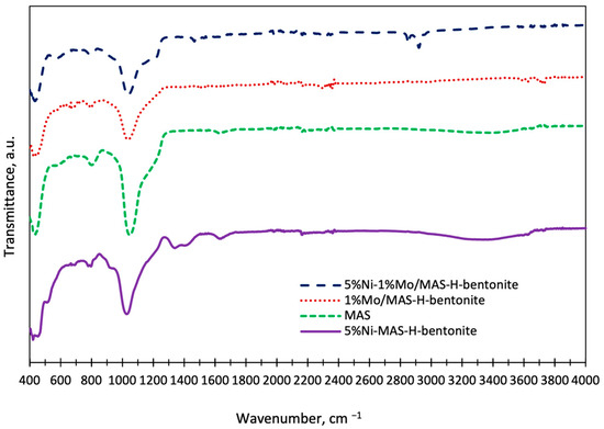 Spectra obtained by FT-IR spectroscopy for mono- and bimetallic systems containing MAS and pre-activated bentonite demonstrate the appearance of the same absorption bands at 450, 800, 930, 1059, 1350, and 1620 cm−1.