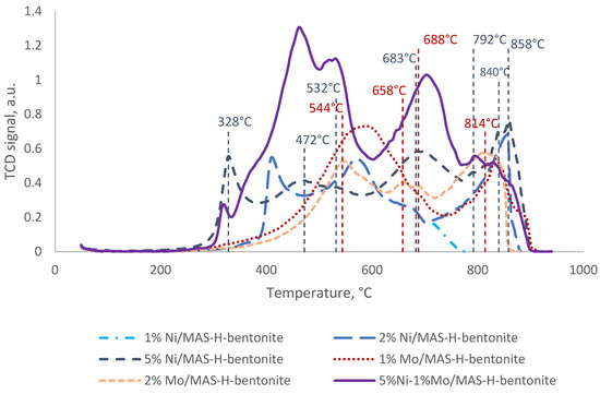 Co-promotion of composite based on MAS and H-bentonite shifts all reduction peaks to lower temperatures. Peaks were observed at 317, 460, 529, 702, 792, and 827 °C; this means the reducing ability of molybdenum and nickel is increased. The peak at 460 °C is associated with the reduction of the NiMoO4 phase [50], which corresponds to the wide-angle scattering data.