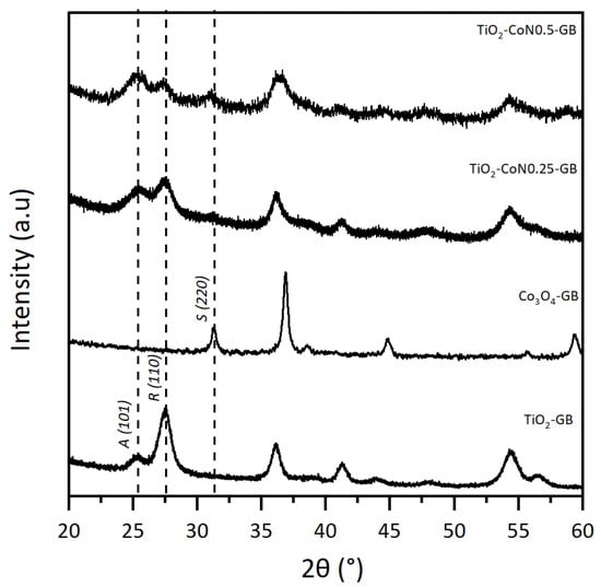 The TiO2/Co3O4 samples prepared with the GB surfactant were selected to illustrate the XRD powder results, shown in Figure 1, with the diffractograms of TiO2-GB, TiO2-CoN0.25-GB, TiO2-CoN0.5-GB, and CO3O4-GB. In order to compare the crystal structures of the TiO2-Co3O4 hybrid powders to those of the individual oxides, a Co3O4 powder (1:1:1 ratio) was synthesized using the same procedure as described above. On the TiO2-GB diffractogram, the presence of TiO2 characteristic peaks was noted at 25.4° for the anatase phase (A), and at 27.5° for the rutile phase (R) [32]. For the Co3O4-GB powder, the characteristic peak of the spinel phase (S) was observed at 31.3° [33].