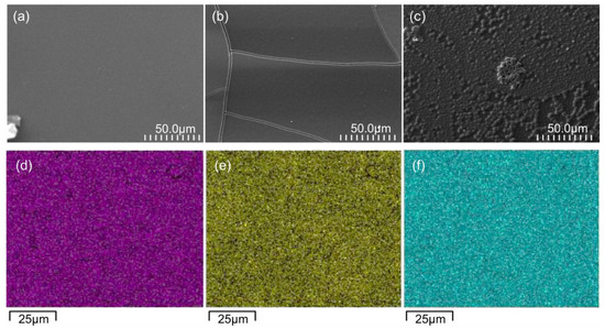 SEM images of the surfaces of (a) TiO2-GC, (b) TiO2-CoN0.25-GC, and (c) TiO2-CoN0.5-GC. EDX mapping of TiO2-CoN0.5-GC sample: in pink (d), distribution of Ti element; in yellow (e), Co element; and, in blue (f), O element.