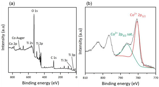 An XPS analysis was performed to determine the surface composition of the thin films. For the hybrid materials, the total spectrum of the TiO2-CoN0.5-GC sample is shown in Figure 4a, and is similar to those of the other samples, regardless of the ratio used. For the total spectrum, we observed the presence of the same chemical elements as in the TiO2 thin films (C, O, Ti and Sn, and In from the ITO substrate) and, in addition, the cobalt Co 2p appears at high binding energies [35]. The Co Auger peak corresponds to the emission of an electron during the de-excitation of the Co atom.