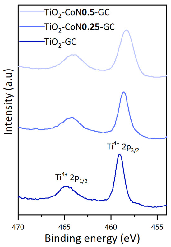 To evaluate the effect of the addition of cobalt oxide on the titanium oxide, the Ti 2p spectra for the three samples synthesized from the GC surfactant are shown in Figure 5.
